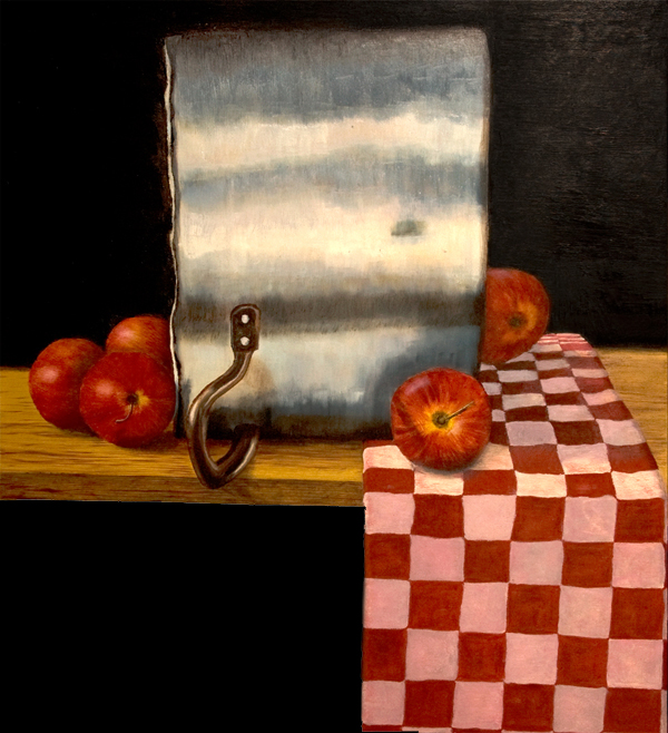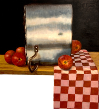 Pan met appels 50cm x 30cm Olieverf op masoniet (Klik op de afbeelding om te vergroten) |
