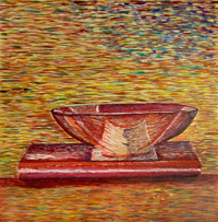 Schaal+rood boek 40cm x 40cm Olieverf op masoniet (Klik op de afbeelding om te vergroten) |